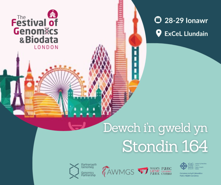 Ar 28 a 29 Ionawr, bydd Partneriaeth Genomeg Cymru yn arddangos yng Ngŵyl Genomeg a Bioddata yn Excel Llundain. Dewch o hyd i ni yn